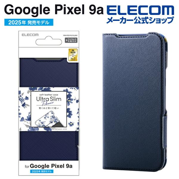 Google Pixel 9a 用 ソフトレザーケース 薄型 磁石付 フラワーズ ケース カバー 手帳型 UltraSlim 超軽量 ネイビー PM-P251PLFUJNV エレコム 在庫処分