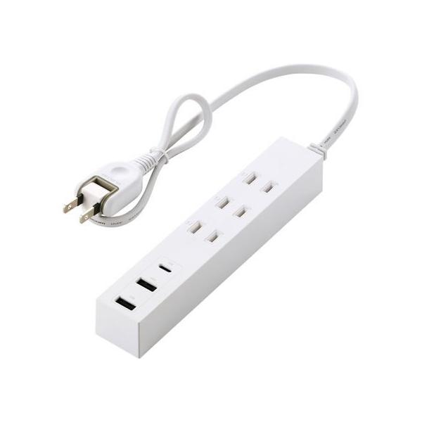 - エレコム T-U08-3A2C05WH 延長コード 電源タップ USB タップ 0.5m コンセント 3口 Type-C ×1 USB-A ×2 雷ガード ホワイト 発売日:2025年7月12日●ACアダプターなしで複数台のデバイスを、これ1台で充電可能。3つのAC差込口、2つのUSB-Aポート、1つのUSB Type-C(TM)ポートが一体になったUSBタップです。最大6台のデバイスを接続でき、コンセントの少ない場所で活躍します。熱硬化性樹脂二重構造やトラッキング防止を備え、発熱・火災を防ぐ安心設計です。●ACタップとUSBポートが一体になった、スマートフォンやワイヤレスイヤホンなどを充電できるコード付きUSBタップです。ACアダプターなどを別途用意することなく、本製品1つで充電できます。●USB-Aポート×2、USB Type-C(TM)ポート×1を搭載。USB Type-Cポートからは最大15Wでの充電が可能です。●幅が約33mmのスリム形状なので、机の上など狭い場所に設置しやすく、遠くにあるコンセントやUSB充電器を手元に置くことができます。●USB-Aポートには接続機器を自動で見分け、適した出力で充電する「おまかせ充電」機能を搭載しています。●差込口には、未使用時にホコリの侵入を防止する「ホコリ防止シャッター」を装備しています。●本体筐体には高い難燃性を備えたPC樹脂、差込口周りには熱硬化性樹脂(ユリア樹脂)を用いた二重構造で、万が一の発熱の際に融解しにくく、電気火災の防止に有効です。●サージ電流耐量2750A/5回、2500A/10回、制限電圧775Vmax(25A 8/20μs)の素子(バリスタ)を搭載しており、誘導雷による雷サージを吸収して接続機器を保護します。●※直撃雷や、誘導雷であっても素子の許容値を超える雷サージが発生した場合、接続機器を保護できない場合があります。また、受けた電圧や回数により性能は劣化します。●差込口には海外製のスマートプラグなど、極性による栓刃幅の違いがある2ピンプラグの接続も可能です。 【仕様】差込口仕様:Aタイプ 2ピン差込口個数:3個口差込口間隔:27mm(差込口中心間寸法)プラグ仕様:Aタイプ 2ピンACコード長:約0.5mUSB端子形状:USB Type-C(TM)ポート×1、USB-Aポート×2AC側定格:14A 125V 1400WまでUSB側定格入力:AC100V-125V 50/60Hz 0.6AUSB側定格出力(1ポート使用時):USB Type-Cポート:15W(5V/3A)、USB-Aポート:12W(5V/2.4A)USB側定格出力(2ポート使用時):USB Type-Cポート+USB-Aポート:合計15W(5V/3A)(USB Type-C 15W(5V/3A)、USB-A 12W(5V/2.4A))、USB-Aポート+USB-Aポート:合計15W(5V/3A)(各USB-A 12W(5V/2.4A))USB側定格出力(3ポート使用時):USB Type-Cポート+USB-Aポート+USB-Aポート:合計15W(5V/3A)(USB Type-C 15W(5V/3A)、各USB-A 12W(5V/2.4A))極性対応:△(差込口は対応、プラグは目印のみ)スイッチ:×雷ガード:○ホコリシャッター:○(AC差込口のみ)抜け止め機能:×通電表示ランプ:×二重構造:○