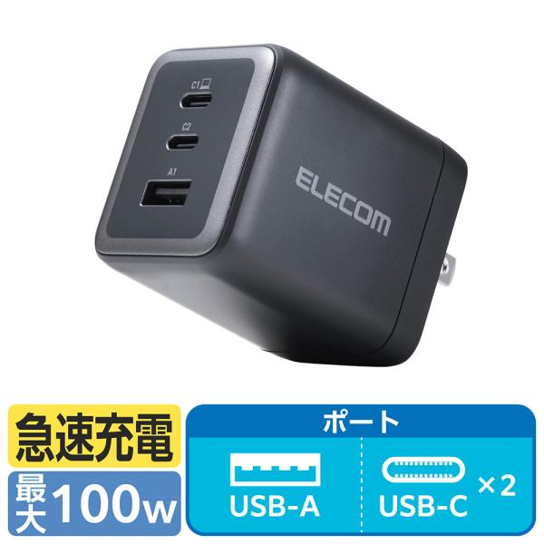 Yahoo 通販 4549550367509 4E3013 エレコム USB Power Delivery 100W AC充電器(C×2 A×1)ブラック EC-AC104100BK USB充電器 PD対応 100W 急速充電 GaN II 窒化ガリウム Type-C 2ポート USB-A 1ポート 3ポート AC充電器 コンパクト 折りたたみプラグ ノートPC ゲーミングPC MacBook Pro スマホ タブレット 同時充電 高出力 小型 軽量 PSE認証 サーマルプロテクション 温度監視 安全設計 iPhone iPad Android ELECOM 黒 USB-C PPS対応 出張 旅行 在宅勤務 テレワーク 複数デバイス マルチ充電 省スペース 携帯性 パワーデリバリー TypeC 超高速充電器 - 楽天での商品説明(エレコムダイレクトショップ)