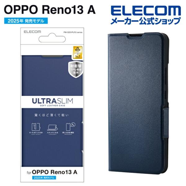 OPPO Reno 13A 用 ソフトレザーケース 薄型 磁石付 OPPOReno13A ソフトレザー ケース カバー ネイビー PM-O251PLFUNV エレコム 在庫処分