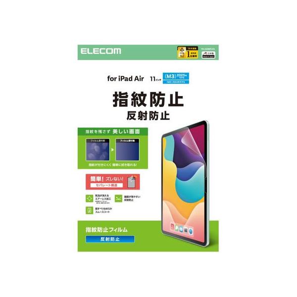 - エレコム iPad Air 11インチ (M3/M2) 2025/2024年 フィルム 指紋防止 反射防止 アンチグレア 貼りやすい 貼り直し可能 カバー クリア TB-A25MFLFA 対応機種: 11インチiPad Air(M3)、11インチiPad Air(M2) 画面を傷や汚れから守る、指紋防止・反射防止タイプの画面保護フィルムです。 光の映り込みを抑え、見やすい画面を実現する反射防止タイプです。 時間の経過とともに気泡が目立たなくなる、特殊吸着層を採用したエアーレス加工を施しています。 小さな気泡ができたときには、指などで押し出すことで気泡を抜くことができます。 【仕様】 ■対応機種:11インチiPad Air(M3)、11インチiPad Air(M2) ■対応モデル番号:A3270、A3267、A3266、A2904、A2903、A2902 ■セット内容:画面保護フィルム(エアーレス ■指紋防止 ■反射防止タイプ)×1、ホコリ取りシール×1、クリーニングクロス(乾式)×1、ヘラ×1 ■材質:接着面:シリコン、外側:PET 【説明】 ■画面を傷や汚れから守る、指紋防止 ■反射防止タイプの画面保護フィルムです。 ■光の映り込みを抑え、見やすい画面を実現する反射防止タイプです。 ■時間の経過とともに気泡が目立たなくなる、特殊吸着層を採用したエアーレス加工を施しています。 ■小さな気泡ができたときには、指などで押し出すことで気泡を抜くことができます。 ■摩擦を軽減した表面仕上げで、さらさらした快適な操作を実現します。 ■指紋汚れを付きにくくする指紋防止コーティングを施しています。 ■フィルムを貼ったままでも端末操作ができるタッチスクリーン入力に対応しています。 ■貼り付け面にシリコン皮膜をコーティングし、接着剤や両面テープを使わずに貼り付け可能な自己吸着タイプです。貼りやすく、貼り直しも可能です。 ■端末の形状に合わせたサイズにカット済みなので、パッケージから取り出してすぐに使用可能です。 ■貼り付けの際ズレ防止の固定シールが付いており、位置決めが簡単。貼り付け面はセパレートカット構造のため貼り付けやすい加工になってます。 ※フィルムを画面に貼り付けると薄く痕が残ったように見えますが、時間がたつと目立たなくなります。 ■フィルムがキレイに貼れる専用ヘラと、クリーニングクロス、ホコリ取りシールが付属しています。 ■自社環境認定基準を1つ以上満たし、『THINK ECOLOGY』マークを表示した製品です。 ■環境保全に取り組み、製品の包装容器が紙 ■ダンボール ■ポリ袋のみで構成されている製品です。 【商品に関するお問い合わせ】 エレコム製品サポート 8056.jp をご確認ください。 商品コード39078192131商品名エレコム iPad Air 11インチ (M3/M2) 2025/2024年 フィルム 指紋防止 反射防止 アンチグレア 貼りやすい 貼り直し可能 カバー クリア TB-A25MFLFA型番TB-A25MFLFAカラークリア※他モールでも併売しているため、タイミングによって在庫切れの可能性がございます。その際は、別途ご連絡させていただきます。※他モールでも併売しているため、タイミングによって在庫切れの可能性がございます。その際は、別途ご連絡させていただきます。