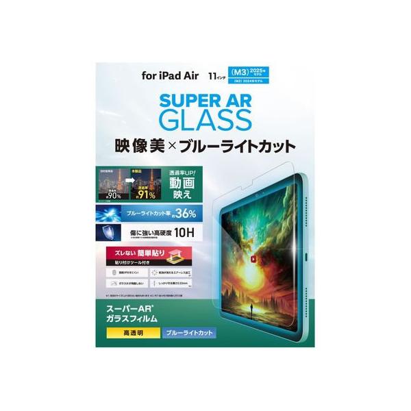 - 【商品説明】動画視聴の際などに光の映り込みに邪魔されずに視聴することができる、ブルーライトカットタイプの画面保護ガラスフィルムです。 透過率を上げることで反射率を下げるスーパーAR加工で、通常の高透明ガラスに比べ非常に見やすくなります。 通常の高透明ブルーライトカットガラスの透過率が約90%に対して、約91%の高透過率です。 ※メーカー画面保護ガラスフィルム製品内の比較【仕様】●対応機種:11インチiPad Air(M3)、11インチiPad Air(M2) ●対応モデル番号:A3270、A3267、A3266、A2904、A2903、A2902 ●セット内容:画面保護ガラスフィルム(スーパーAR、ブルーライトカットタイプ)×1、ガイドフレーム×1、ホコリ取りシール×1、クリーニングクロス(乾式)×1、ヘラ×1 ●材質:接着面:シリコン、外側:ガラス・PET、ガイドフレーム:ABS ●ブルーライトカット率:約36% <ジェットプライス>