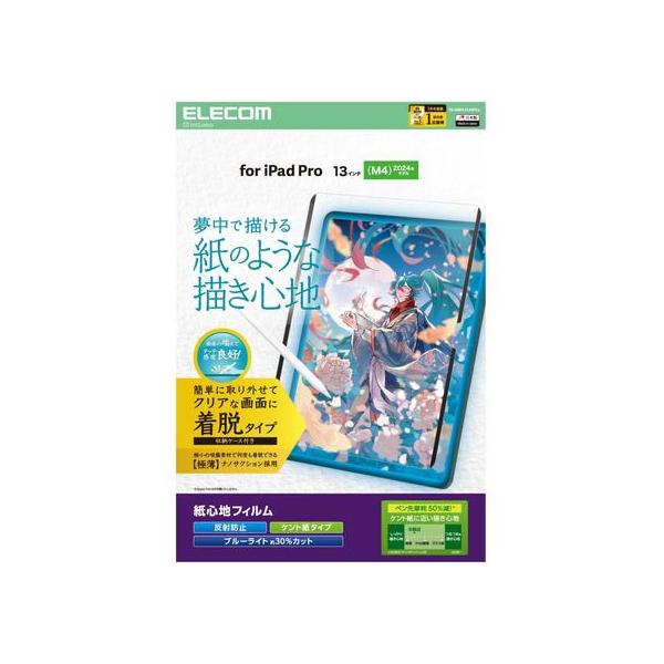 - 【商品説明】動画視聴の際などに取り外して使える着脱式で、端末本来のクリアな画面を楽しめる指紋防止、反射防止タイプの紙心地フィルム。 特殊表面形状デザインにより、ケント紙に鉛筆で描いたような描き心地を実現します。 ペン先の磨耗を50%低減させるため、タッチペンを長く使用できます。 ※メーカー製品 FLAPLシリーズと比較。 何度でも着脱できる新素材“ナノサクション”を採用し、滑り落ちにくく快適に使用可能。【仕様】●対応機種:13インチiPad Pro(M5)/13インチiPad Pro(M4) ●対応モデル番号:A3361、A3360、A3007、A2926、A2925 ●セット内容:着脱式画面保護フィルム(紙心地・反射防止・ケント紙タイプ)×1、収納ケース×1 ●材質:吸着面:アクリル、外側:PET ●ブルーライトカット率:約30% ●取り付け方法:ナノサクション採用フレームが画面へ吸着 <ジェットプライス>