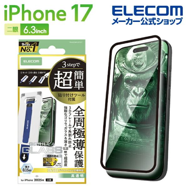 iPhone 17 用 ガラスフィルム フレーム付 ゴリラ サムライ 超簡単貼付ツール iPhone17 ガラス 液晶 保護フィルム ELECOM PM-A25AFLGFOST エレコム 在庫処分
