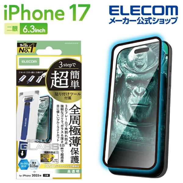 iPhone 17 用 ガラスフィルム フレーム付 ゴリラ サムライ ブルーライトカット iPhone17 ガラス 液晶 保護フィルム ELECOM PM-A25AFLGFOSTB エレコム 在庫処分