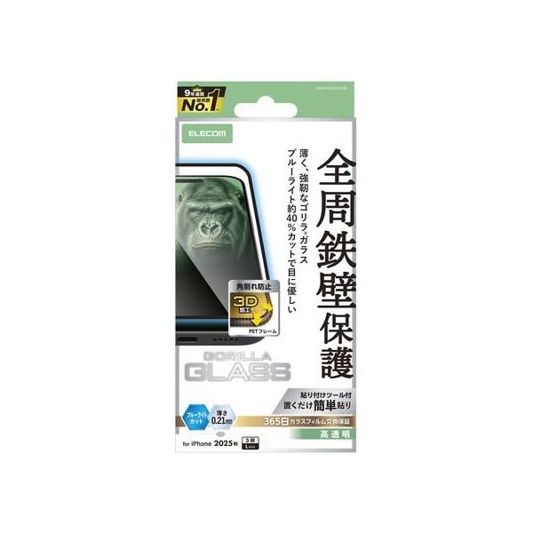 - 【商品解説】なめらかな指滑りを実現するリアルガラスを採用。Gorilla(R)ガラスを採用し3D設計のPETフレームで角割れを防ぐブルーライトカットタイプの画面保護ガラスフィルムです。ガラスフィルムを衝撃から守るPET素材のフレームが付いており、四つ角が割れない安心設計です。ガラス厚約0.21mmで高い感度を実現。端末の画面と同じ、強じんなGorilla(R)ガラスを採用しています。ディスプレイが発する光の中の青い部分「ブルーライト」を約40%カットします。※ブルーライトは目の角膜や水晶体で吸収されずに網膜まで到達し、網膜の機能低下を引き起こす場合があるといわれています。※インカメラでの撮影を妨げないように、インカメラ部分はフィルムを接着しない設計にしています。表面硬度10Hの強化ガラス採用により、保護ガラス表面の傷を防止します。※エレコム社基準による鉛筆硬度試験での実力値です。指紋・皮脂汚れが付きにくく、残った場合でも簡単に拭き取れる指紋防止加工を施しています。貼り付け面にシリコン皮膜をコーティングし、接着剤や両面テープを使わずに貼り付け可能な自己吸着タイプです。貼りやすく、貼り直しも可能です。時間の経過とともに気泡が目立たなくなる、特殊吸着層を採用したエアーレスタイプです。特殊な飛散防止設計により、万が一割れてしまった際にもガラス片が飛散することなく、高い安全性を実現しています。端末の形状に合わせたサイズにカット済みなので、パッケージから取り出してすぐに使用可能です。フィルムを装着した状態でFace ID機能を利用する場合は、フィルム装着後にFace IDの再登録を行ってください。貼り付けの際にずれやすいフィルムをぴったり位置合わせできる貼り付けツールの他、キレイに貼り付けるためのクリーニングクロス、ホコリ取りシールが付属しています。自社環境認定基準を1つ以上満たし、『THINK ECOLOGY』マークを表示した製品です。環境保全に取り組み、製品の包装容器において、原料に占める石油系プラスチック代替原料の割合が10%を超えている製品です。【スペック】●型式:PMA25DFLGFOBL(PMA25DFLGFOBL)●JANコード:4549550390781素材 / 機能:ブルーライトカット機種:iPhone 17 Pro Max仕様1:セット内容:画面保護ガラスフィルム(フレーム付き、Gorilla(R)ガラス0.21mm、ブルーライトカットタイプ)×1、クリーニングクロス(乾式)×1、ホコリ取りシール×1、貼り付けツール×1材質:接着面:シリコン、外側:ガラス・PETこの商品は宅配便でお届けする商品です出荷可能日から最短日時でお届けします。※出荷完了次第メールをお送りします。配送サービス提供エリアを調べることができます「エリア検索」をクリックして、表示された画面にお届け先の郵便番号7桁を入力してください。ご購入可能エリア検索お買い上げ合計3,980円以上で送料無料となります。※3,980円未満の場合は、一律550円(税込)となります。●出荷可能日から最短日時でお届けします。(日時指定は出来ません。) ※お届け時に不在だった場合は、「ご不在連絡票」が投函されます。 「ご不在連絡票」に記載された宅配業者の連絡先へ、再配達のご依頼をお願いいたします。●お届けは玄関先までとなります。●宅配便でお届けする商品をご購入の場合、不用品リサイクル回収はお受けしておりません。●全て揃い次第の出荷となりますので、2種類以上、または2個以上でのご注文の場合、出荷が遅れる場合があります。詳細はこちら■商品のお届けについて商品の到着日については、出荷完了メール内のリンク(宅配業者お荷物お問い合わせサービス)にてご確認ください。詳しいお届け目安を確認する1度の注文で複数の配送先にお届けすることは出来ません。※注文時に「複数の送付先に送る」で2箇所以上への配送先を設定した場合、すべてキャンセルとさせていただきます。