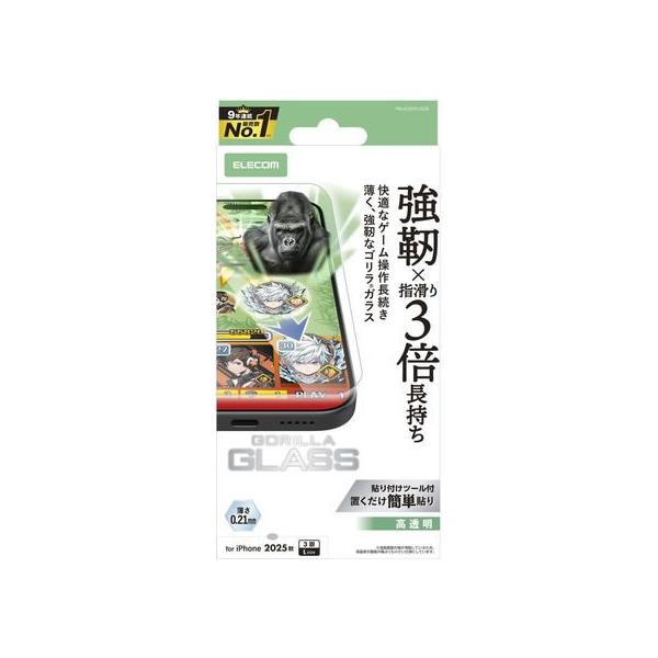 - 送料規定・納期はこちらでご確認下さい。【主な特長】ゲーム操作に最適な長持ちコーティング!ガラス特有のなめらかな指滑りを実現するGorilla(R)ガラスを使用した高透明タイプの画面保護ガラスフィルムです。ぴったり位置合わせできる貼り付けツール付きです。■ゲーム操作に最適な長持ちコーティング!なめらかな指滑りを実現するリアルガラスのGorilla(R)ガラスを使用した薄型タイプの画面保護ガラスフィルムです。 ■ガラス厚約0.21mmで高い感度を実現。端末の画面と同じ、強じんなGorilla(R)ガラスを採用しています。 ■指滑り約3倍長持ちの特殊加工で快適なゲーム操作が持続します。 ※PM-A25DFLGGとの比較 ■表面硬度10Hの強化ガラス採用により、保護ガラス表面の傷を防止します。 ■※当社基準による鉛筆硬度試験での実力値です。 ■高精細な画質を損ねない高い透明度を実現します。 ■指紋・皮脂汚れが付きにくく、残った場合でも簡単に拭き取れる指紋防止加工を施しています。 ■貼り付け面にシリコン皮膜をコーティングし、接着剤や両面テープを使わずに貼り付け可能な自己吸着タイプです。貼りやすく、貼り直しも可能です。 ■時間の経過とともに気泡が目立たなくなる、特殊吸着層を採用したエアーレスタイプです。 ■握ったときやかばんから取り出すときにも引っかかりにくいように、エッジに丸みをもたせた「ラウンドエッジ加工」を施しています。 ■特殊な飛散防止設計により、万が一割れてしまった際にもガラス片が飛散することなく、高い安全性を実現しています。 ■端末の形状に合わせたサイズにカット済みなので、パッケージから取り出してすぐに使用可能です。 ■※画面の端が湾曲しているため、表示画面の幅よりも小さい仕様にしています。 ■フィルムを装着した状態でFace ID機能を利用する場合は、フィルム装着後にFace IDの再登録を行ってください。 ■貼り付けの際にずれやすいフィルムをぴったり位置合わせできる貼り付けツールの他、キレイに貼り付けるためのクリーニングクロス、ホコリ取りシールが付属しています。 ■自社環境認定基準を1つ以上満たし、『THINK ECOLOGY』マークを表示した製品です。 ■環境保全に取り組み、製品の包装容器において、原料に占める石油系プラスチック代替原料の割合が10%を超えている製品です。■対応機種:iPhone 17 Pro Max ■セット内容:画面保護ガラスフィルム(ゲーミング、Gorilla(R)ガラス0.21mm、高透明タイプ)×1、クリーニングクロス(乾式)×1、ホコリ取りシール×1、貼り付けツール×1 ■材質:接着面:シリコン、外側:ガラス・PET