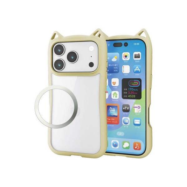 - 送料規定・納期はこちらでご確認下さい。【主な特長】猫耳型のアクセントが可愛らしく、背面のクリアパネルで端末本来のカラーを活かしながら、遊び心と実用性を兼ね備えたハイブリッドケースです。■猫耳型のアクセントが可愛らしく、背面のクリアパネルで端末本来のカラーを活かしながら、遊び心と実用性を兼ね備えたハイブリッドケースです。 ■2種の素材を特殊成型し、強じんな耐久性としなやかな弾力性をあわせ持ったハイブリッドケースです。 ■背面は高硬度5Hの軽くて丈夫なポリカーボネート素材を採用しています。 ■※表面硬度は実力値です。 ■猫耳型の穴はストラップホールとして使用できます。 ■画面および背面カメラや背面の傷つきを防ぐ、ガード設計です。 ■各種コネクターやボタン周りまでケースが覆うので、安心して使用できます。 ■ストラップの取り付けができる、ストラップホールが付いています。 ■※本製品にストラップは付属していません。 ■ケースを装着したままで、各種ケーブルの接続や写真撮影、ボタンの操作が可能です。 ■ショルダーストラップやハンドストラップが取り付けられる、ストラップホールシート(1つ穴・半透明タイプ)が付属しています。 ■本製品はワイヤレス充電に対応しています。 ■※お使いの充電器や環境によっては正常に充電できない場合があります。 ■磁力吸着タイプのスタンドなどの製品に対応したメタルステッカーが付属しています。 ■※メタルステッカー使用時は磁力装着タイプ以外のワイヤレス充電器には対応しません。 ■※メタルステッカーに磁力はありません。■対応機種:iPhone 17 Pro ■セット内容:ケース本体×1、ストラップホールシート(1つ穴・半透明タイプ)×1、メタルステッカー×1 ■材質:ケース本体:TPU(熱可塑性ポリウレタン)・ポリカーボネート、ストラップホールシート:PVC・亜鉛合金、メタルステッカー:鉄 ■カラー:キナコ ■ワイヤレス充電器対応:○