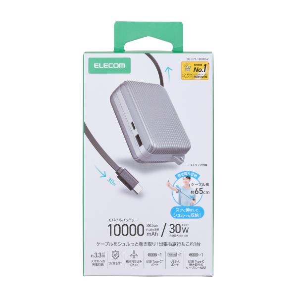 エレコム モバイルバッテリー 巻き取り式 ケーブル一体型 モバイルバッテリー 10000mAh 30W リチウムイオン電池 Type-C シルバー ELECOM DE-C79-10000SV