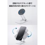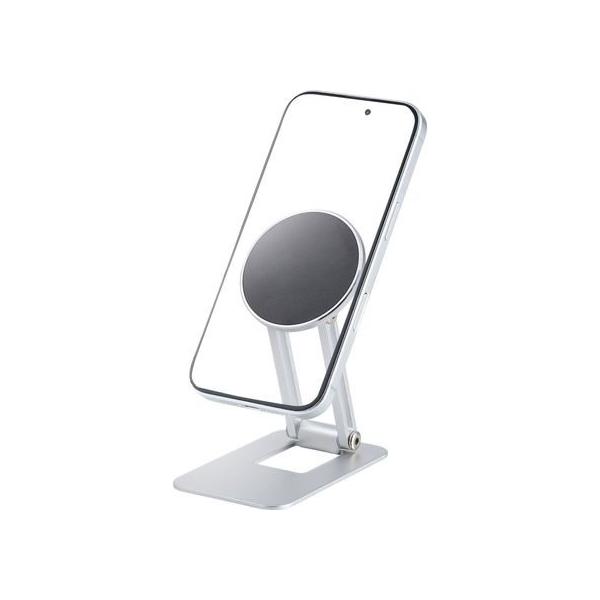 - 【商品説明】マグネットで簡単にスマートフォンの着脱可能。MagSafe対応スマホケースや付属のメタルプレートと併用することで、MagSafe非対応の端末でも使用できます。 マグネット部分は360度回転し、スマホの縦向き・横向きの切り替えがスムーズです。 折り畳み式で使わないときも場所を取らず、スッキリ収納できます。 上下180度角度の調節が可能。写りの良いアングルで写真撮影やビデオ通話が楽しめます。【仕様】●対応機種:MagSafe対応iPhone ※2025年12月現在。磁力装着できない機種は、付属のメタルプレートを貼り付けて使用可能です。 ※ケースの材質、厚みなどによって対応できない場合がありますのでご了承ください。 ●外形寸法:W約60mm×D約96mm×H約17mm(折り畳み時) ●内容物:スタンド×1、メタルプレート×1 ●材質:スタンド:アルミニウム・PVC・シリコン、メタルプレート:鉄 ●重量:スタンド本体:約87g、メタルプレート:約2g ●耐荷重:約300g ●カラー:シルバー <ジェットプライス>