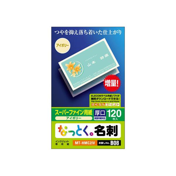 - 【商品解説】●印字面は両面塗工仕様で、デジカメ画像などの写真付き名刺の作成に適します●名刺サイズにカットされたカット紙名刺です。プリンターにそのまま差し込んで印刷できます●インクジェットプリンタ専用紙(アイボリー)●紙厚(厚手)210g/m0.245mm●120枚入り(両面)●名刺サイズでカットされているからエッジの仕上がりがきれい●インクジェット専用紙ですのでインクジェットプリンタ以外のプリンタ、コピー機などではご使用出来ません●名刺サイズ(91x55mm)【スペック】●型式:MT-HMC2IV(MTHMC2IV)●JANコード:4953103046535この商品は宅配便でお届けする商品です出荷可能日から最短日時でお届けします。※出荷完了次第メールをお送りします。配送サービス提供エリアを調べることができます「エリア検索」をクリックして、表示された画面にお届け先の郵便番号7桁を入力してください。ご購入可能エリア検索お買い上げ合計3,980円以上で送料無料となります。※3,980円未満の場合は、一律550円(税込)となります。●出荷可能日から最短日時でお届けします。(日時指定は出来ません。) ※お届け時に不在だった場合は、「ご不在連絡票」が投函されます。 「ご不在連絡票」に記載された宅配業者の連絡先へ、再配達のご依頼をお願いいたします。●お届けは玄関先までとなります。●宅配便でお届けする商品をご購入の場合、不用品リサイクル回収はお受けしておりません。●全て揃い次第の出荷となりますので、2種類以上、または2個以上でのご注文の場合、出荷が遅れる場合があります。詳細はこちら■商品のお届けについて商品の到着日については、出荷完了メール内のリンク(宅配業者お荷物お問い合わせサービス)にてご確認ください。詳しいお届け目安を確認する1度の注文で複数の配送先にお届けすることは出来ません。※注文時に「複数の送付先に送る」で2箇所以上への配送先を設定した場合、すべてキャンセルとさせていただきます。