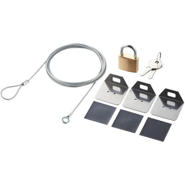 - マスターキー仕様セキュリティロックキット ■プリンター、モニター、PC本体の3台を同時にワイヤーで通して固定する事により盗難から守る。 ■製品種類:南京錠+ワイヤー ■対応スロットサイズ:その他:接着 ■通常、マスター、統一、その他:マスター ■セット内容:南京錠、カギ2本、取付パーツ×3個、両面シール×3個 ■寸法:南京錠:幅30×奥行12.5×高さ48.5mm、取付パーツ:幅40×奥行40×高さ20mm ■ワイヤー長さ:1.7m ■ワイヤー太さ:2.2mm ■ワイヤー材質:スチール+ソフトPVCコーティング ■ワイヤー色:シルバー ■その他:マスターキーは別売りです。マスターキー注文時の型番:ESL-KEY 詳細スペック 電気用品安全法(本体)非対象 電気用品安全法(付属品等)非対象 電気用品安全法(備考)電気の通らない製品の為