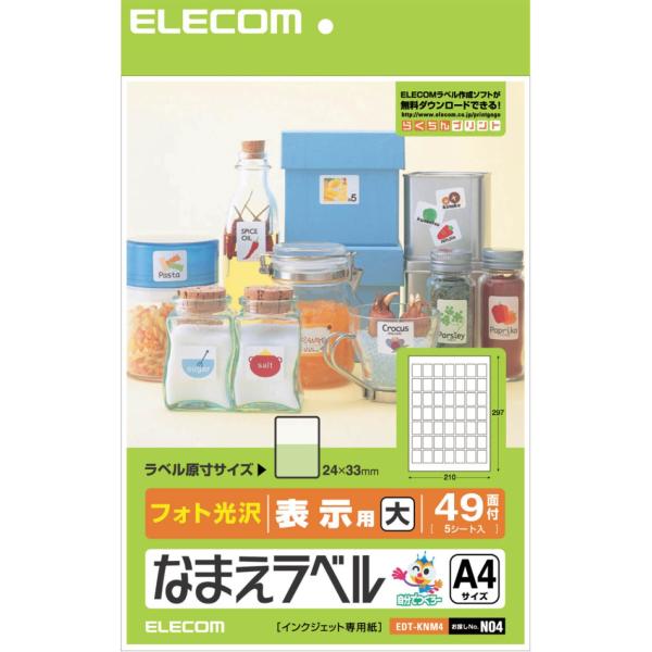 - -------------------------------------------------------------- 画像はイメージです。 ※ PC環境により実際の色味や質感と異なって表示される場合がございます。 ※ 部品・パーツなどの一部の商品では本体の商品画像を使用しております。 ※ 製品の仕様・画像・パッケージは、メーカー側から予告なく変更される場合があります。 -------------------------------------------------------------- ■ フォト光沢仕様の汎用なまえラベル汎用タイプのなまえラベルです。デジカメなどの写真画像の印刷に最適なフォト光沢ラベル仕様です。インクの吸収性に優れ、色鮮やかなペン用のなまえラベルが作成できます。用紙サイズ:210×297mm(A4サイズ)用紙:フォト光沢紙ラベル一面サイズ:24×33mm入数:5シート面付数:49面枚数:245枚紙厚:0.192mm 【メーカー・ブランド】 エレコム / えれこむ / ELECOM / 【#1】