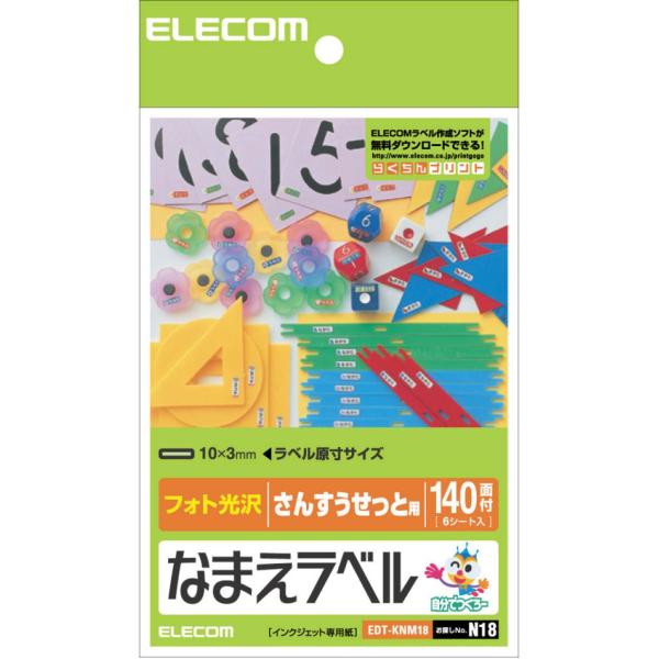 - [エレコム なまえラベル(さんすうセット用) EDT-KNM18 [EDTKNM18]] の商品説明●さんすうせっと用の極小サイズラベルです。●高級感あふれる色鮮やかさ、カラーインクジェットプリンタ対応です。●デジタルカメラなどの写真画像の印刷に最適なフォト光沢ラベル仕様です。●インクの吸収性・耐水性に優れ、色鮮やかなラベルが作成できます。●カット済みですので、台紙からはがして簡単に貼り付けできます。●面付:140面 (7列×20段)。●シート数:6シート (ラベル数:140枚×6シート=840枚)。●坪量174g/m2 紙厚0.192mm。[エレコム なまえラベル(さんすうセット用) EDT-KNM18 [EDTKNM18]]のスペック●入り数:6シート●タイプ(用紙):フォト光沢●ラベル数:840枚(140面×6シート)●ラベル1面寸法:W1.0×D0.3cm○返品不可対象商品