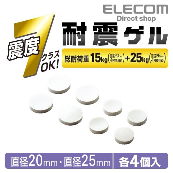 - エレコム(ELECOM) 耐震ゲル 耐荷重15/25kg TG-013 4953103165427 ● 阪神淡路大震災、新潟中越地震の地震波再現振動試験にパスした抜群の粘着力 ● 対候性・耐久性に優れたオレフィン系素材を使用 ● はがせるので、レイアウト変更時にも安心 ● 比較的軽量なモノを複数固定できる、お得なセット 【仕様】 ■ サイズ : 直径25mm×H5mm/直径20mm×H5mm ■ 重量 : φ25:2.5g(1枚)/φ20:2g(1枚) ■ カラー : グレー ■ 入り数 : φ25:4枚/φ20:4枚 ■ 負荷荷重 : φ25:耐荷重:25kg(4枚使用)/φ20:耐荷重:15kg(4枚使用)