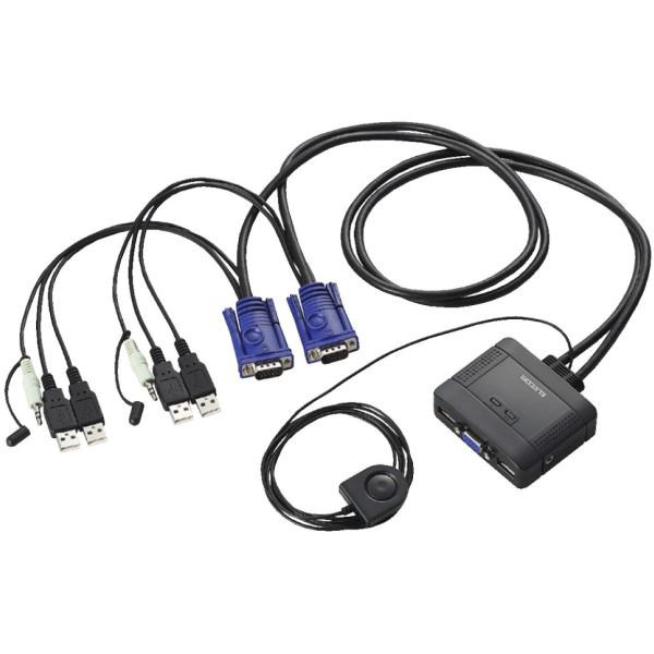 - 【返品種別A】□「返品種別」について詳しくはこちら□2008年07月 発売メーカー保証期間 1年1組のUSBマウス・USBキーボード・モニタ・スピーカを2台のPCで共用できる切替器1セットのUSBマウス・USBキーボード・アナログ対応モニタを使ってパソコンを2台操作できるパソコン切替器です。PS/2ポートを装備しないノートパソコンやMacintoshでも使用可能です。パソコンが2台あっても入出力機器が1セットで済み、省スペースを実現します。コンパクトなケーブル一体型タイプで、他にケーブルを準備する必要はなく、本製品を用意するだけで使用可能です。また、スピーカ入出力端子も装備し、2台のパソコンでスピーカの共用も可能です。USBハブを接続して3台以上のUSB機器を共有可能USBポートを2ポート装備し、さらにUSBハブを接続することで、USBマウスを含めて3台以上のUSB機器を共有することが可能です。※ハードディスクドライブやフラッシュメモリを接続する場合、 「安全な取り外し」操作を行ってから切替えてください。 取り外し操作を行わずに切替えるとデータ破損の恐れがあります。※切替器に接続できるUSB機器の消費電力は合計1500mW(300mA)以下です。多機能マウス/キーボード対応チルトホイール機能や多ボタン搭載の多機能マウス、多機能キーボード、キーボード/マウスセットでも使用可能です。高解像度対応モニタは最大2048×1536ドットの高解像度に対応し、高画質表示を実現します。※ワイド解像度は非対応です。4:3の解像度設定でお使いください。手元スイッチで簡単切替手元スイッチを押すだけで、PCの切替ができます。スイッチは手元に設置することができます。Macintoshの切り替えも可能PS/2ポートが付いていないMacintoshとWindowsPCとの切替が行えます。切替先がわかる表示ランプ装備選択中のパソコンがすぐにわかる表示ランプを装備しています。切替時にビープ音が鳴らない静音設計切り替え時のビープ音はありませんので、自宅や静かなオフィスで頻繁にパソコンを切り替えても、切替音を気にすることなく操作できます。ステータス記憶Caps Lock、Num Lock、Scroll Lockの各キーのオン/オフは、パソコンを切り替えても保持可能です。簡単セットアップ面倒なドライバのインストール作業が不要で、接続後すぐに使えます。最大PC接続台数2台対応機種Windows Vista/XP(〜SP2)/2000(〜SP4)/Me/98SE/98/Server2003/2000Advanced Server/2000Serverが動作するWindowsマシンMac OS X(10.3〜10.5)が動作するIntelMacおよびPowerMac切替方式手元スイッチ最大解像度2048×1536※ワイド解像度は非対応です。4:3の解像度設定でお使いくださいインターフェイスパソコン側・USB A(オス)×4・ミニD-Sub15ピン(オス)×2・3.5mmステレオミニ(オス)×2周辺機器側・USB A(メス)×2・ミニD-Sub15ピン(メス)×1・3.5mmステレオミニ(メス)×1消費電力130mWケーブル長切替器本体〜コネクタ部 :0.9m切替器本体〜手元スイッチ:1.8mサイズ本体 : 幅78.4×奥行62.4×高さ24.5mm(ケーブルを含まず)手元スイッチ : 幅30.0×奥行35.0×高さ10.2mm(ケーブルを含まず)質量305g(ケーブルを含む)[KVMKUS]パソコン周辺>電源タップ・ケーブル・切替器