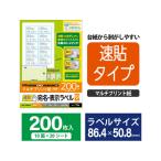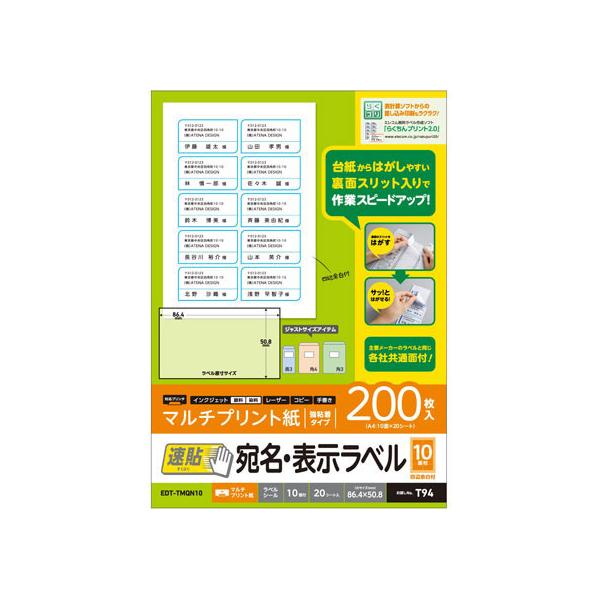 - [エレコム 宛名表示ラベル(速貼タイプ・10面×20シート) EDT-TMQN10]の商品説明●インクジェットプリンタ、レーザープリンタ、コピー機でも使用できるマルチタイプのラベル用紙です。●台紙からはがしやすく、効率よく宛名貼り作業を行える『速貼』宛名・表示ラベルです。●主要メーカーラベルと同じ各社共通面付タイプです。(10面付)●ラベルを簡単にはがせる裏面スリット入りで作業効率が大幅にアップします。●手書きも可能で、手軽に宛名ラベルを作成することができます。●無料でダウンロードできるエレコムのラベル作成ソフト「らくちんプリント2.0」で、簡単にデザイン・印刷が可能です。●「らくちんプリント2.0」を使って、表計算ソフトからの差し込み印刷も簡単です。[エレコム 宛名表示ラベル(速貼タイプ・10面×20シート) EDT-TMQN10]のスペック●用紙サイズ:幅210mm×高さ297mm ※A4サイズ●一面サイズ:86.4mm×50.8mm●ラベル枚数:200枚 ※20シート×10面●用紙タイプ:マルチプリント紙●カラー:ホワイト●紙厚:0.15mm●坪量:140g/m2●テストプリント用紙:テストプリント用紙1枚入り●お探しNo.:T94●その他:面付/10面●セット内容:ラベル×20シート、テストプリント用紙×1枚○返品不可対象商品