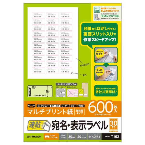 - ↑↑↑正確な在庫状況は上記バナー「在庫状況を確認する」をクリックして頂き、必ずご確認ください。 ■マルチタイプのラベル用紙■各社共通面付タイプ■裏面スリット入りEDTTMQN30品番:EDT-TMQN30用紙サイズ:210×297mm紙質:マルチプリント紙色:ホワイト入数:600枚紙厚:0.15mm坪量:140g/m2面付:30面切り離し後のサイズ:53.3×25.4mm対応プリンタ インクジェット:○ レーザー:○ ドットインパクト:- 熱転写:- コピー:○寸法:幅 0×高さ 0×奥行 0mm質量:約0g付属品:効率よく宛名貼り作業を行える速貼宛名・表示ラベル