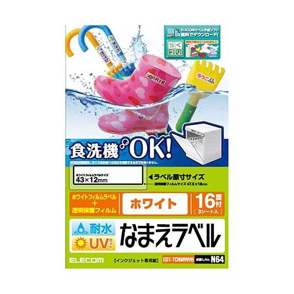 - 〔かさやおもちゃなどのなまえ付けに最適なサイズ〕超強力な耐水性能で食洗機にも対応する耐水耐候なまえラベル。[一片サイズ:43×12mm]■ インクジェットプリンタで手軽でキレイに手作りできる 耐水耐候なまえラベル です。■ エレコム社従来製品から耐水性能が大幅にアップし、食洗機にも対応しています。※ エレコム社試験結果。全ての食洗機への対応を保証するものではありません。食洗機の方式、使用する洗剤等によっては、はがれたり、にじんだりする場合があります。予めご了承ください。■ 印字した文字がくっきり見えるホワイトタイプのラベルで、柄や濃い色の素材に貼る際便利です。■ 文字こすれやキズ付きを予防し耐久性を向上させる保護フィルムが付属しています。■ 保護フィルムはUVカット率90%で、屋外などで使用する際も印刷した文字などの退色を予防します。 エレコム 〔インクジェット〕 耐水耐候なまえラベル 48片 (はがきサイズ 16面×3シート・ホワイト) EDT-TCNMWH5 (EDTTCNMWH5)