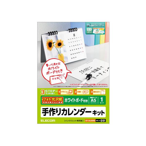 - [エレコム カレンダーキット(ホワイトボード付き)光沢 EDT-CALA5KWB]の商品説明●ご家庭にあるインクジェットプリンタでカレンダーが簡単に作れるキットです ●ホワイトボードがついた卓上タイプのカレンダーです(※ホワイトボードには印刷できません) ●写真が鮮やかに印刷できるフォト光沢タイプ ●試し刷りに便利なテストプリント用紙付き ●両面印刷対応。表面(光沢紙)、裏面(普通紙) ●用紙サイズ A5 坪量 157g/? 紙厚0.19mm ●お探しNO.Q101[エレコム カレンダーキット(ホワイトボード付き)光沢 EDT-CALA5KWB]のスペック●用紙サイズ:A5サイズ(148×210mm) ●用紙枚数:13枚 ●用紙タイプ:フォト光沢紙(両面印刷対応:表面光沢紙/裏面普通紙) ●紙厚:0.19mm ●坪量:157g/m2 ●対応インク:顔料・染料対応 ●お探しNo.:Q101 ●セット内容:A5サイズカレンダー用紙×13枚/ホワイトボード×1枚/カレンダー台紙×1枚/テストプリント用紙×1枚/とじリング×2個/作り方説明書×1枚○返品不可対象商品