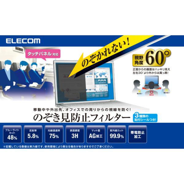 - サイズ:11.6Wインチ(16:9)256.5mm×144.5mm◆商品名:エレコム プライバシーフィルター 覗き見防止 11.6インチ MacbookAir11インチ対応 EF-PFS116W新幹線での移動中や先でも周りからの視線を防いで安心してパソコン操作ができる、のぞき見防止フィルター “アイバリアー"です。画面の正面を中心に60°(左右30°)より外の角度からは画面がまっ黒に見えるので、パソコン画面を見られる心配がありません。反射率5.8%と照明や外光などの表面反射を軽減しますので、画面の見やすさを向上します。透過率75%で目に優しく見やすい明るさを保ちます。表面硬度3Hと硬度が高いので、フィルター表面のキズを防止します。新幹線での移動中や先でも周りからの視線を防いで安心してパソコン操作ができる、のぞき見防止フィルター アイバリアーです。画面の正面を中心に60°(左右30°)より外の角度からは画面がまっ黒に見えるので、パソコン画面を見られる心配がありません。
