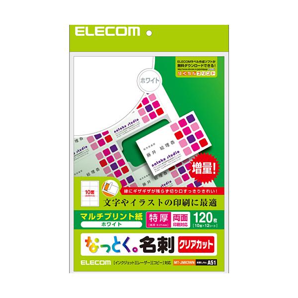 - 【商品説明】縁にギザギザが残らず切り口がきれいに仕上がるクリアカットタイプの名刺用紙 なっとく。名刺 です。しっかりとした厚みで上品に仕上がる特厚タイプです。プリンタを選ばないマルチプリント紙の名刺用紙です。文字やイラストの印刷に適しています。インクジェットプリンタはもちろん、レーザープリンタ、熱転写プリンタ、コピー機で使用可能です。【仕様】●カラー:ホワイト●その他:クリアカット●用紙サイズ:A4●用紙タイプ:マルチプリント紙●紙厚:0.235mm●坪量:210g●テストプリント用紙:1枚入●お探しNo.:A51●用紙枚数:12枚(10面付け)【検索用キーワード】えれこむ エレコム elecom MT−JMK3WN 名刺用紙クリアカット特厚120枚ホワイト MTJMK3WN名刺 名刺コピーペーパー コピー用紙 プリント用紙 名刺用紙 プリント用紙 名刺用紙 S11252しっかりとした厚みで上品に仕上がる特厚タイプ