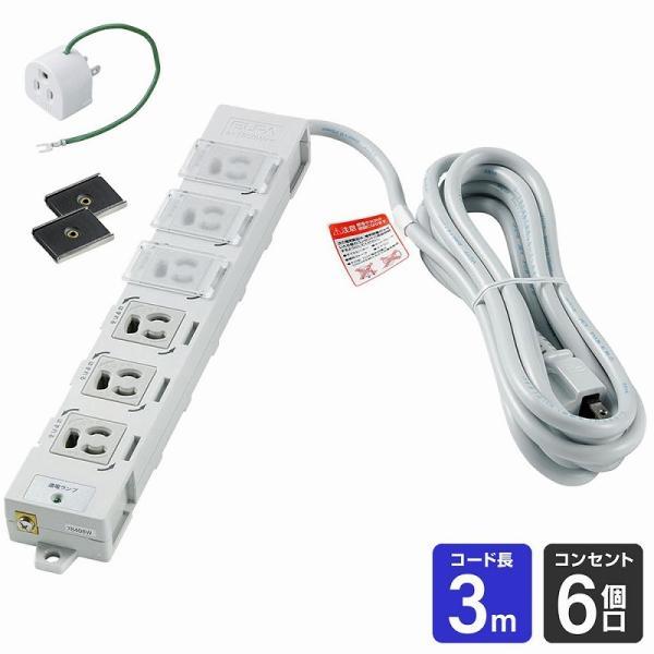 - 商品情報商品の説明■定格:AC125V 15A ■合計1500Wまで ■使用温度範囲:-10度~40度 ■屋内専用 ■コード長:3m ■口数:6個口 ■付属品:接地アダプター、マグネット(2個)主な仕様 ●専用カバー付で使用していない差込口へのホコリの侵入を防ぎます。 ●マグネットは3面に取り付けできるのでコードの引き回しもスッキリ。 ●プラグ抜け止めで不意の力によるプラグ抜けが無く、コンピューターなどの データをしっかりガードします。 ●アース対応。 ●断線しにくく被覆強度の高いコード。