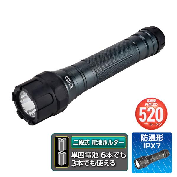 - 商品はご注文後2〜5営業日で発送いたします。 ※欠品等により遅れる場合は事前にご連絡いたします。●水まわりでも安心の防浸形(IPX7) ●ラバー搭載で衝撃に強い ●急な電池切れを防ぐ、電池残量インジケーター ●電池6本または3本でも使える ■使用電池:単四形アルカリ乾電池×6本または3本(別売) ■連続点灯時間 【電池6本使用時】HI 約4時間30分 / LOW 約18時間 【電池3本使用時】HI 約3時間 / LOW 約11時間 ※アルカリ乾電池使用時 ※電池の性能、使用条件により連続点灯時間は短くなる場合があります ■光源:白色LED×1灯 ■明るさ 【電池6本使用時】HI 約520lm / LOW 約200lm 【電池3本使用時】HI 約350lm / LOW 約130lm ※アルカリ乾電池初期時 ■外形寸法(約):直径42×全長200(mm)(最大値) ■質量:約195g(電池除く) ■防水仕様:IPX7(防浸形)