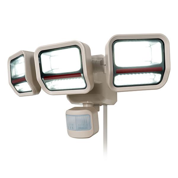 - 【特徴】・センサーが人や車の動きを検知して自動点灯します。・屋外に設置できる防水仕様 (IP45 防噴流形) です。・常時点灯に切り替えできます。 ※点灯開始照度の設定や周囲の明るさに関係なく常時点灯します。・センサーが反応しない時は赤色警告灯が点灯します。【本体仕様】検知方式:赤外線受動式電源電圧:AC100V 50/60Hz消費電力:約21W(待機時 約0.5W)光源:白色LED ※LEDの交換はできません。全光束:全点灯時 : 約2200lm点灯保持時間:約5秒 / 30秒 / 3分間 ※点灯中に人を検知すると点灯し続けます。点灯開始照度:約10lx(夜)〜(昼)保護等級:IP45(防噴流形)使用周囲温度範囲:?10℃〜+40℃電源コード長:約3m質量:約1012g(電源コード含む)外形寸法 (約):幅302×高さ167×奥行157 (mm) (最大値)付属品:取付ネジ 2本(Φ4×30mm)、コンクリート用スリーブ 2本(Φ6×28mm)、クランプ 1セット、取付ガイド1枚検索用カテゴリ535
