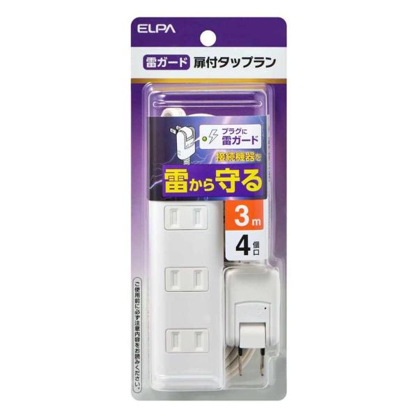 朝日電器 ELPA エルパ 雷ガード 扉付タップラン 4個口 ホワイト コード長3m [電源タップ コンセント 延長 節電 耐雷サージ スイングプラグ] WBT-N4030SB(W) 爆買