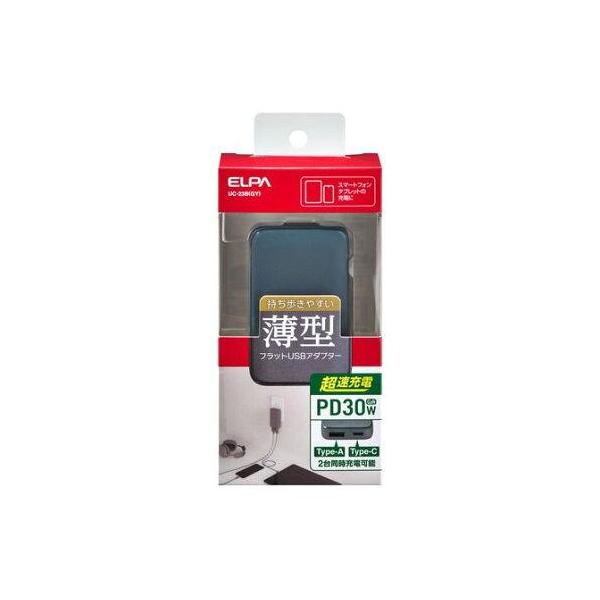 ELPA(朝日電器) UC23BGY フラットUSBアダプター USB Type-Ax1 Type-Cポートx1 薄型 PD30W(UC-23B(GY))