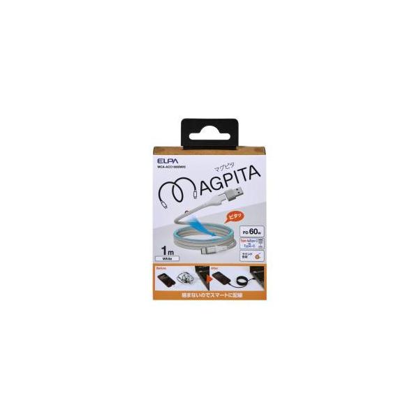 ELPA(朝日電器) MCAACC1060WH マグネットケーブル コードが絡まない USB-C to Cケーブル + USB-A 1m(MCA-ACC1060(WH))
