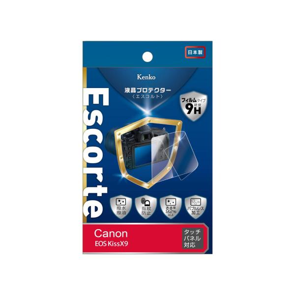 - [主な特徴] ●液晶プロテクターEscorte(エスコルト)は、史上最高硬度により、従来の機能を保ちながらこれまでになり保護力を実現しました。 ●フィルムタイプで表面硬度9Hを実現!擦り傷などの細かい傷がつきづらいので視認性の低下を防ぎます。 ●撥水・撥油コーティングで指紋などの汚れをさっと簡単にふき取ることが可能です。 ●全光線透過率92.0%を実現した高光沢フィルムが優れた透明感を発揮します。 ●気泡が残らない、バブルレス加工済み。 ●両端に持ち手があるので、シート本体を汚すことなく簡単、きれいに貼りつけることができます。 [主な仕様] フィルムタイプ:撥水・撥油コーティング+ハードコート9Hタイプ 表面加工:グレア加工(光沢仕上げ) 厚さ:125ミクロン 粘着:気泡消滅タイプ(シリコン) ※表示パネル用フィルムは付属いたしません [対応機種] キヤノン Canon EOS Kiss X9