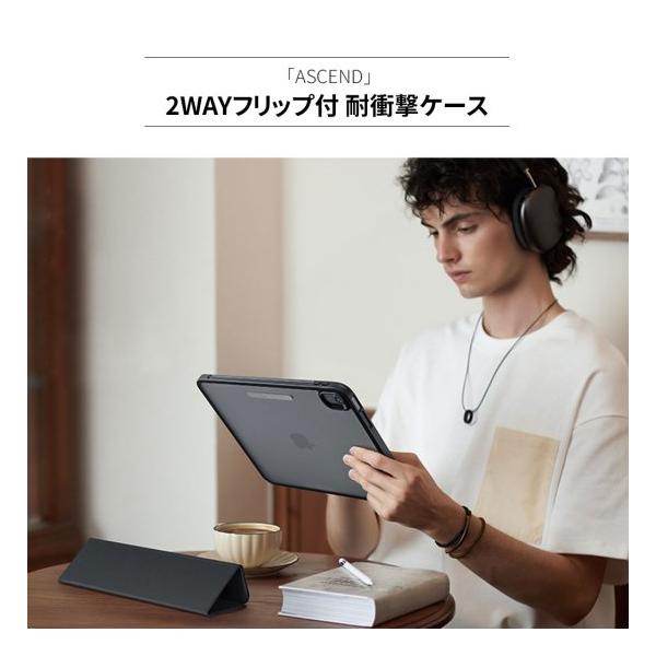 ESRの「ASCEND 2WAYフリップ付 耐衝撃ケース」は取り外しできるマグネット式のカバーで、フリップタイプとしても背面カバータイプとしても使用可能なiPadケースです。