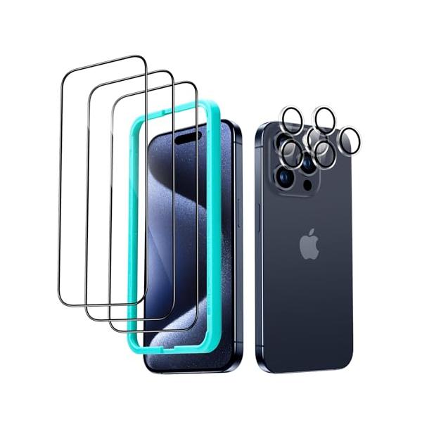 3+2 セット+ガイド枠ESR iPhone 15 Pro ガラスフィルム 強化ガラス保護フィルム 3 枚 独立型レンズフィルム 2セット 気泡