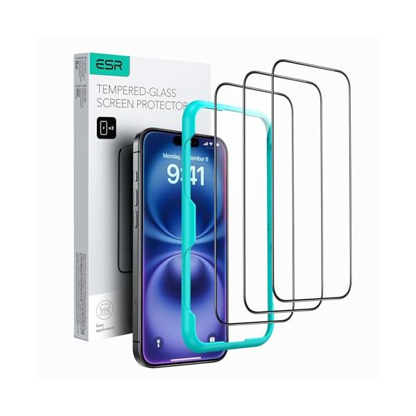 ESR iPhone 16 ガラスフィルム iPhone 15 ガラスフィルム 3枚入り+ ガイド枠 高透過率 指紋防止 いphone16 保護