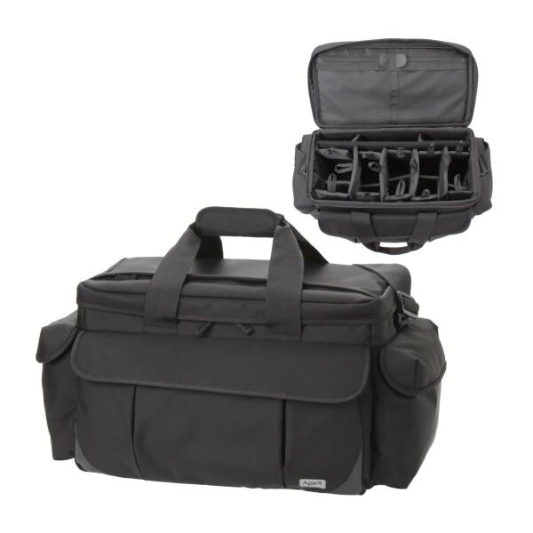 【大容量ショルダーカメラバッグ】カメラマンの必要な一眼レフやミラーレス、レンズをまとめて収納する大容量カメラバッグ。メイン収納には、バッテリーグリップ付き一眼レフや150-600mmクラスの望遠ズームがそのまま入ります。独立したPC収納には最大で15インチMacBookProが収納可能。A4ファイルや書類、雑誌のスペースに。PC部にはプラボード+衝撃吸収材使用の中仕切りでハードな使用から機材を保護します。付属のT型パーテーション中仕切りで、大口径レンズをセットした一眼レフを下向きに収納して取り出し易さを向上。仕切りとは別にレンズフラップが付属しているため、小型レンズやアクセ