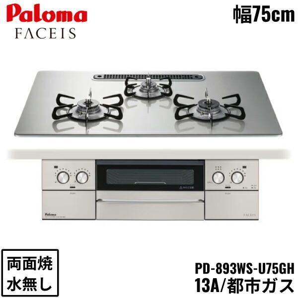 PD-893WS-U75GH/13A パロマ Paloma ビルトインコンロ FACEIS GRAND ガラストップ 75cm 都市ガス 水なし 両面焼 左右強火力 送料無料