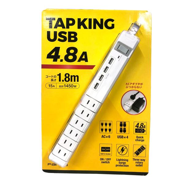 - 【Fargo】TAPKING USB 4.8A タップPT605WH 商品名TAPKING USB AC6個口 4.8A USB4ポート 定格容量15A・100〜125V (1450Wまで)、耐トラッキングカバー付プラグ 電源コード長1.8m 家庭用ACコンセント6個口(回転式0度、90度、180度で固定可能) ほこり侵入防止シャッター30度、60度、120度、150度へ回転時 充電用USBポート4個口(合計 4.8A) 雷サージガードサージ機能時LED点灯 一括電源スイッチブレーカー内蔵 カラーホワイト 本体サイズ約長さ 30cm×幅 4cm×高さ 4.5cm 重さ約 613g 材質製品本体/難燃性PC樹脂 特長雷サージガード搭載、ほこりシャッター付、家庭用AC電源6個口、 充電用USB4ポート付、絶縁カバー付きプラグ、ブレーカー内蔵一括スイッチ付 商品詳細 ■特徴■ ・タブレットやスマートフォン、ゲームデバイス機器を高出力4.8A対応で急速充電が可能。 ・AC差込口を回転させ、差込角度を3段階調整できるので、ACアダプタを複数並べてもお互いに干渉しないスマートデザイン採用。 ・使わないAC差込口を斜めに固定すると、ホコリ・ゴミの侵入を防ぐ防塵設定が可能。