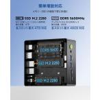 - 商品特徴 GMKtec NucBox K8 Plusは、AMD Ryzen 7 8845HSを搭載した高性能ミニPCです。 8コア16スレッド、最大5.1GHz動作の高性能CPUと32GBの大容量メインメモリ、1TBのM.2 PCIe 4.0 高速SSDを搭載することで画像や動画編集なども快適に行えます。 HDMIとDisplayPort、USB4端子を組み合わせて最大4画面同時出力に対応し、在宅ワークのようなビジネスからプライベートまで、省スペースで生産性を最大限に高めることができます。 詳細スペック ■OS:Windows 11 Pro ■プロセッサ:AMD Ryzen 7 8845HS ・コア数/スレッド数:8 コア 16 スレッド ・ブースト動作周波数:5.1 GHz ・総合 TOPS:最大38 TOPS ・NPU TOPS:最大16 TOPS ■グラフィックス:AMD Radeon 780M ■メモリ ・規格:SO-DIMM DDR5-5600 MHz ・搭載容量:2× 16 GB (最大96 GB) ・空きスロット:なし ■内蔵ストレージ ・規格:1× M.2 2280 NVMe (PCIe 4.0) ・容量:1 TB ・増設スロット:1× M.2 2280 NVMe (PCIe 4.0) (最大4 TB) ■映像出力:1× HDMI 2.1、1× DisplayPort 2.1、2× USB4 (最大8K@60 Hz) ■音声出力:HDMI、オーディオ端子 ■有線LAN:2× 2.5G LAN ■無線LAN:Wi-Fi 6 ■Bluetooth:BT 5.2 ■インターフェース ・背面ポート:2× USB 2.0、1× HDMI 2.1、1× DisplayPort 2.0、2× 2.5G LAN、1× USB4、1× ケンジントンロック ・前面ポート:1× OCuLink、1× USB4、2× USB 3.2 Gen2 (Type-A)、1× 3.5 mmオーディオ端子、1× 電源ボタン ■冷却方式:ファン&ヒートシンク ■VESA:対応 (100 mm、75 mm) ■ケンジントンロック:対応 ■保証期間:1年 ■付属品:1× ACアダプター、1× ACケーブル、1× HDMIケーブル、1× VESAマウント、1× ネジセット ※ACアダプター、ACケーブルは製品付属のものをご使用ください ■本体サイズ:125 × 132 × 58 mm (D×W×H) ■本体重量:約600 g ■パッケージサイズ:185 × 187 × 106 mm (D×W×H) ■パッケージ重量:約1.8 kg ※注意事項:DisplayPort→HDMI/DVI変換を行う場合は、アクティブタイプの変換アダプタを使用してください。パッシブタイプの変換アダプタは使用できません。 ※すべてのアクティブタイプ変換アダプタでの動作を保証するものではありません。アクティブタイプでも動作しない場合もあります。 ※商品仕様は、予告なく変更される場合がございます。最新の情報は各メーカページをご確認ください。 商品画像 参考画像