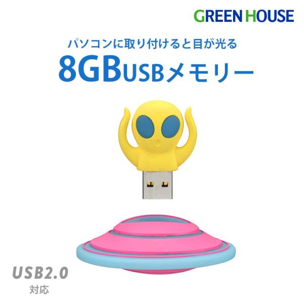 宇宙人USBメモリー 8GB キャップ付 USB2.0対応 最大480Mbps 蓄光 暗闇で光る フラッシュメモリ データ保存 バラエティ雑貨 GH-UFDAL8G-YL グリーンハウス
