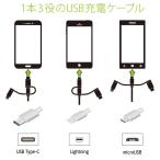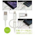 - iPhoneやiPadの充電とデータ転送が可能なLightningコネクタとAndroidスマートフォンの充電とデータ転送が可能なUSB Type-C / microUSBコネクタの3種の端子を搭載した充電/データ転送ケーブルです。Lightningコネクタ搭載機器、USB Type-Cコネクタへの充電は、microUSBコネクタにケーブル直付けの変換アダプタを取り付けることにより可能になります。iPhoneでもスマホでも、このケーブル1本で対応するので、家族でiPhoneとスマートフォンの両方をお持ちの方や、iPadとAndroidスマートフォンをご利用の方、iPhoneとNexus7をご利用の方など、複数の機器をお持ちの方にオススメです。※3種類同時に充電・データ転送することはできません。安心のApple正規ライセンス取得製品。Apple社認証の「Made for iPod/iPhone/iPad」モデルです。Lightningコネクタを搭載したすべてのiPod / iPhone / iPadで安心してご使用いただけます。断線しにくいナイロンケーブル。USB3.1規格に準拠した転送速度10Gbpsのデータ転送に対応しています。iPhone/スマートフォンの急速充電※が可能。※急速充電とは、500mA〜1000mA以上の出力でその機器が充電される状態です。2重シールドケーブル。