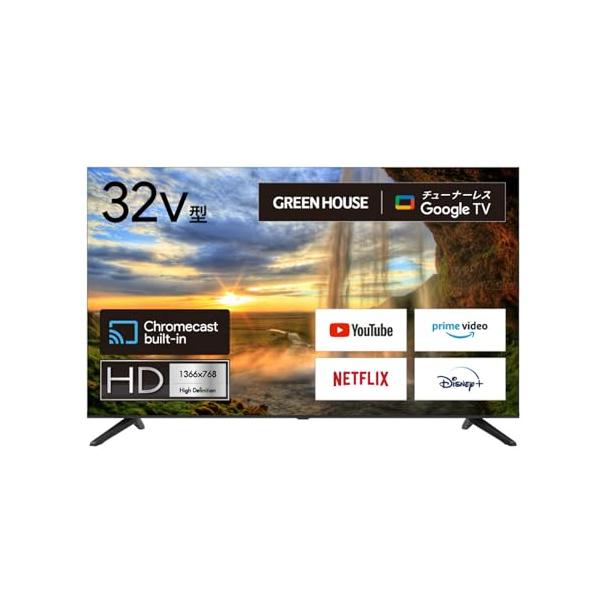 - 【商品解説】●YouTubeやNetflix、Amazon Prime Video、Disney+など、さまざまなネット動画配信サービスに対応、視聴履歴や好みに合わせて、おすすめコンテンツを一括表示します。※一部機能の使用にはGoogleアカウントでのログインが必要です。●ネット動画視聴に特化したチューナーレステレビ※地上デジタル放送およびBS/CSデジタル放送を視聴の際は、別途外付けチューナーが必要です。●Chromecast機能対応スマートフォンで見ていた映像やゲームなどを大画面で楽しめます。※コンテンツまたはアプリがChromecast機能に対応している必要があります。●Google アシスタント機能対応付属の音声操作対応リモコンを使用し、Google アシスタントボタンを押して話しかけることで、お気に入りのテレビ番組を探して再生したり、調べ物をしたりとハンズフリーで操作可能です。※機能の使用にはGoogleアカウントでのログインが必要です。●世界トップシェアメーカー製SoC搭載Media Tek社製スマートテレビ用チップセットを採用●広視野角パネル採用高いコントラスト比でメリハリのある、引き締まった美しい映像が見える広視野角VAパネルを採用しています。●ベゼルレスフレームの採用枠が細いベゼルレスフレームを採用し、画面を最大に活用した、より迫力のある映像を楽しむことができます。●HDMIケーブル同梱別途用意する必要はありません。●安心の1 年間保証【スペック】●型式:GH-GTVM32B-BK(GHGTVM32BBK)●JANコード:4511677134548本体サイズ(幅×高さ×奥行)mm:W720×H466×D178本体重量(kg):3.6画面サイズ:32V型入力端子:コンポジットビデオ入力(映像入力用×1、ステレオ音声用×2) HDMI×2 LAN端子×1 USB2.0端子×2出力端子:音声光デジタル出力 (S/PDIF出力端子)×1Bluetooth対応:Bluetooth対応画素:ハイビジョンminiLEDバックライト対応:miniLEDバックライト非対応チューナーレス:チューナーレスYouTube対応:YouTube対応Netflix対応:Netflix対応Hulu対応:Hulu対応Amazon Prime Video対応:Amazon Prime Video対応U-NEXT対応:U-NEXT対応DAZN対応:DAZN対応Tver対応:Tver対応dアニメ対応:dアニメ対応Disney+対応:Disney+対応AbemaTV:AbemaTV対応dTV:dTV対応2画面機能:2画面機能なしDOLBY VISION:DOLBY VISION非対応DOLBY ATMOS:DOLBY ATMOS非対応消費電力:60W(0.5W)年間消費電力量:50kWh/年付属品:専用リモコン(赤外線+Bluetooth 音声操作対応) リモコン用乾電池(単4形乾電池×2)、専用電源コード HDMIケーブル、テレビスタンド×2、テレビスタンド取付用ネジ×2 取扱説明書、保証書【注意事項・特記事項】※テレビ放送チューナー(地上波/BS/CS)を搭載していません。※ご利用にはインターネット環境が必要です。※有料コンテンツを視聴する際は別途配信会社との契約が必要です。※ネットワーク接続や設定は承れません。※セッティングに必要な部材(アンテナケーブル、分波器、HDMIケーブル等)はお客さまにてご用意ください。※付属部材が不明な場合は商品の付属品欄をご確認ください。この商品は宅配便でお届けする商品です出荷可能日から最短日時でお届けします。※出荷完了次第メールをお送りします。配送サービス提供エリアを調べることができます「エリア検索」をクリックして、表示された画面にお届け先の郵便番号7桁を入力してください。ご購入可能エリア検索お買い上げ合計3,980円以上で送料無料となります。※3,980円未満の場合は、一律550円(税込)となります。●出荷可能日から最短日時でお届けします。(日時指定は出来ません。) ※お届け時に不在だった場合は、「ご不在連絡票」が投函されます。 「ご不在連絡票」に記載された宅配業者の連絡先へ、再配達のご依頼をお願いいたします。●お届けは玄関先までとなります。●宅配便でお届けする商品をご購入の場合、不用品リサイクル回収はお受けしておりません。●全て揃い次第の出荷となりますので、2種類以上、または2個以上でのご注文の場合、出荷が遅れる場合があります。詳細はこちら■商品のお届けについて商品の到着日については、出荷完了メール内のリンク(宅配業者お荷物お問い合わせサービス)にてご確認ください。詳しいお届け目安を確認する1度の注文で複数の配送先にお届けすることは出来ません。※注文時に「複数の送付先に送る」で2箇所以上への配送先を設定した場合、すべてキャンセルとさせていただきます。