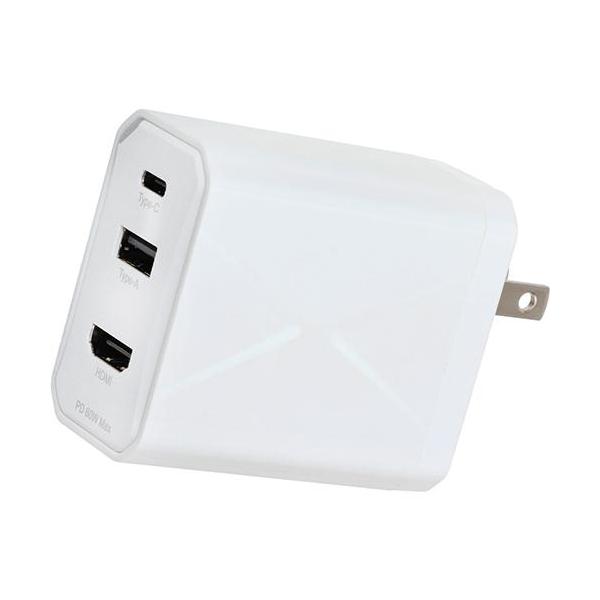 - グリーンハウス GH-ACU3PA-WH マルチドック充電器 USB Type-A/C/HDMI搭載 高出力 PD 60W対応 ホワイト 発売日:2023年9月1日●Nintendo Switch対応、ACアダプタ内蔵で充電しながらゲームができるドックを使わなくても、Switch本体を充電しながらゲーム画面をTVなどの大画面に映せます。また、USB Type-Aポートに周辺機器を接続できます。友達の家など外出先で大画面で遊ぶのに最適です。※別途HDMIケーブルが必要です●PD 60W対応 ノートパソコンやゲーム機の充電/給電に対応Power Delivery 60Wでの給電に対応、コンセントに本製品を接続すれば、USB Type-Cポートから、パソコンやゲーム機へ電源供給しながら本製品を使用することができます。※ノートパソコンがUSB Type-Cポートからの電源供給に対応している必要があります。●すぐに使える2mのUSB Type-Cケーブル(PD60W対応)付属PD60W対応のUSB Type-Cケーブルが付属しているから、購入後すぐに充電できます。※映像出力やUSBハブ機能を使用するには別途ケーブルが必要です。●4K(60Hz)対応のHDMI映像出力でパソコンの画面をテレビなどに表示できる4K(3840 x 2160 60Hz)に対応したHDMI映像出力を搭載し、パソコンやゲームの画面を手軽にテレビやディスプレイの大画面に表示できます。●USBハブ機能で周辺機器も接続できる搭載しているUSB Type-Aポートは、USB Type-Cポートに接続した機器のUSBハブとして機能しており、USB Type-Aを使う様々な機器を接続できます。ノートパソコンにUSB Type-Aポートが少ない/無い場合でも本製品を介してご使用できます。また、ゲーム機の周辺機器を接続しての使用も可能です。●GaN(窒化ガリウム)採用により、高出力&コンパクトGaN(窒化ガリウム)とは、次世代の半導体素材で、GaN半導体は従来のシリコン半導体と比べて高効率・低発熱になり、高出力&コンパクトな製品を実現します。●持ち運びに便利、手のひらサイズのコンパクトボディコンパクトかつ収納式のコンセントプラグを採用しているので持ち運びに便利、外出先でのゲームやプレゼンなどの持ち運んでの使用に最適です。●海外でも使える100V〜240V対応※海外で使用する場合、地域に対応した変換プラグが別途必要となります。●鉛などの含有量を抑えた環境にやさしい、RoHS指令対応欧州の環境基準であるRoHS指令に準拠した、環境にやさしい製品です。電気用品安全法の技術基準に適合確認済(PSE適合) 【仕様】AC入力:AC100V-240V 〜 50-60Hz、 1.5A MaxUSB Type-C:入力(AC入力無し):5V/3A 出力(AC入力あり):5V/3A、 9V/3A、 /12V/3A、 15V/3A、 20V/3A(最大60W) USB規格:USB3.2 Gen1(最大転送速度 5Gbps(理論値))USB Type-A:出力:5V/1A USB規格:USB2.0(最大転送速度 480Mbps(理論値))HDMI:最大 3840 ×2160 (60Hz)HDCP:対応インジケータ:青色点灯:AC入力あり 消灯:AC入力無し外形寸法:W32×D64×H55(mm)重量:約130g動作温度範囲:0℃〜30℃動作湿度範囲:10〜90%(結露なきこと)本体材質:PCRoHS指令:対応VCCI:VCCI Class BPSE:適合保証期間:6ヶ月間