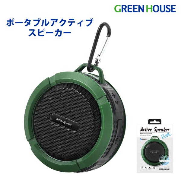 - [グリーンハウス ポータブルアクティブスピーカー グリーン GH-SPBE130ED-GR [GHSPBE130EDGR]] の商品説明●スマホやタブレットとBluetoothでワイヤレス接続。●内蔵バッテリーで3時間使用可能。●4台までのマルチペアリング対応。●スピーカー側で音量調節が可能。●スピーカーでスマホを持たずにハンズフリー通話も可能。●吸盤とカラビナでいろんな場所に設置できる。[グリーンハウス ポータブルアクティブスピーカー グリーン GH-SPBE130ED-GR [GHSPBE130EDGR]]のスペック●Bluetooth規格:Ver.5.0●出力:class2●動作範囲:約10m●対応周波数範囲:2.4GHz帯(2402MHz〜2480NHz)●Bluetoothプロファイル:HFP、A2DP、AVRCP●対応コーデック:SBC●対応外部メモリー:microSD、microSDHC(最大32GB)●対応ファイル形式:MP3/WAV●変調方式:FHSS●搭載端子:micro USB、microSDスロット●電源:DC 5V(USB給電)●バッテリー:リチウムポリマー電池 300mAh●連続再生時間:約3時間●充電時間:約2時間●最大出力:3W●インピーダンス:4Ω●周波数:270Hz〜20kHz●寸法:W8.7×H3.7×D9.6cm●質量:約119g●付属品:micro USB 充電ケーブル(約45cm)、取扱説明書/保証書○返品不可対象商品