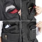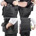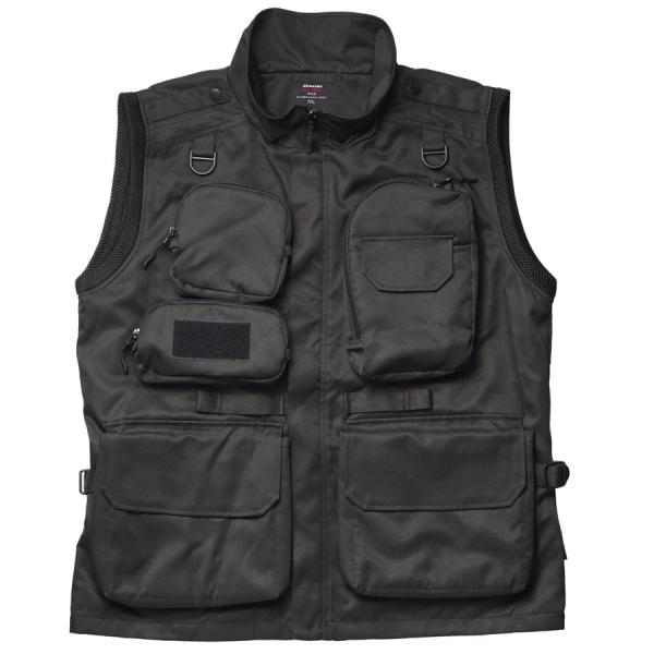 - 撮影を快適にする高機能カメラマンベスト【商品仕様】着丈:約620mm肩幅:約440mm身幅:約530mm重量:約590g材質:ポリエステル撮影時に必要な交換レンズやコンパクトカメラ、フィルター、ストロボ、ミニ三脚、スマートフォン等の小物が入る多数のポケットを装備し、背面の大型ポケットにはA4サイズの書類が入る、収納性に優れたカメラマンベストです。自然に着こなせ、カメラを首から提げた際の不快感を軽減するスタンドカラー(襟)仕様です。 カメラを首から提げた際の不快感を軽減するスタンドカラー仕様 自然に着こなせ、カメラを首から提げた際の不快感を軽減するスタンドカラー(襟)仕様です。 ストラップのずり落ちを防ぐ固定ベルト カメラを肩掛けして携行する際にストラップがずり落ちるのを防ぐ、ホック留めの固定ベルトを左右両肩に装備しています。 カメラの揺れを抑えるストラップ固定ベルト 腹部に設けたホック留めのストラップ固定ベルトにより、カメラを首から提げて携行する際に生じる揺れを抑えます。 機材の傷つきを防ぐファスナー保護カバー 正面中央のメインファスナーには保護カバーを装備しており、ファスナーにより機材が傷つくのを防ぎます。 ウエストサイズを調整できるアジャスターベルト アジャスターベルトにより体型に合わせてウエストサイズを調整できます。 フィルターやレンズキャップ等の収納に適したファスナーポケット 右胸上部に備えたファスナーポケットは、フィルターやレンズキャップ等の収納に適しています。 小物の収納に適したキーフック付きのポケット 右胸下部に備えたファスナーポケットは、コンパクトカメラや小物等の収納に適しています。内側にはキーフックを、外側にはワッペンなどを取り付けられる面ファスナーを装備しています。 ストロボやミニ三脚等の収納に適したファスナーポケット 左胸部分に備えた縦長のファスナーポケットは、ストロボやミニ三脚等の収納に適しています。 スマートフォン等の収納に適したポケット 左胸部分にはスマートフォン等の収納に適した面ファスナー式のポケットを備えています。 クッション材の入った大型ポケット 正面下部にはクッション材入りの大型ポケットを備え、一眼カメラのボディ等を収納できます。 クッション材の入った大型ポケット 正面下部の大型ポケットをは交換レンズの収納にも適しています。 ハンドウォーマーポケット 手を入れるのにちょうど良い位置にハンドウォーマー(=手を温める)ポケットを装備しています。 A4サイズの収納が可能な大型の背面ポケット A4サイズの書類や雑誌等が収納できる大型のファスナーポケットを背面に装備しています。開口部を左右両側に設けており、左右どちらからも出し入れが可能です。 カラビナ等を掛けられるループ カラビナ等を掛けられるループを左右のウエスト部分に装備しており、フォトグローブやポーチ等をぶら下げられます。 Mサイズ着用例 モデル身長/体重:170cm/55kg Mサイズ寸法 着丈:約620mm、肩幅:約440mm、身幅:約530mm 通気性の良いメッシュ裏地 裏地には通気性の良いメッシュを使用しています。内側にポケットはありません。