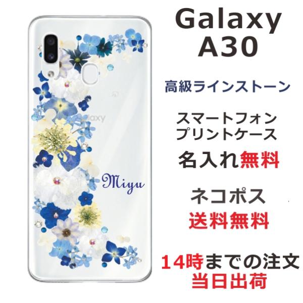 Galaxy A30 ケース SCV43 ギャラクシーA30 カバー ラインストーン かわいい フラワー 花柄 らふら 名入れ 押し花風 クレシェンドブルー