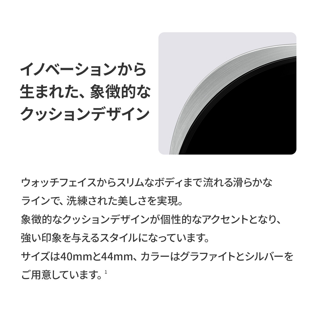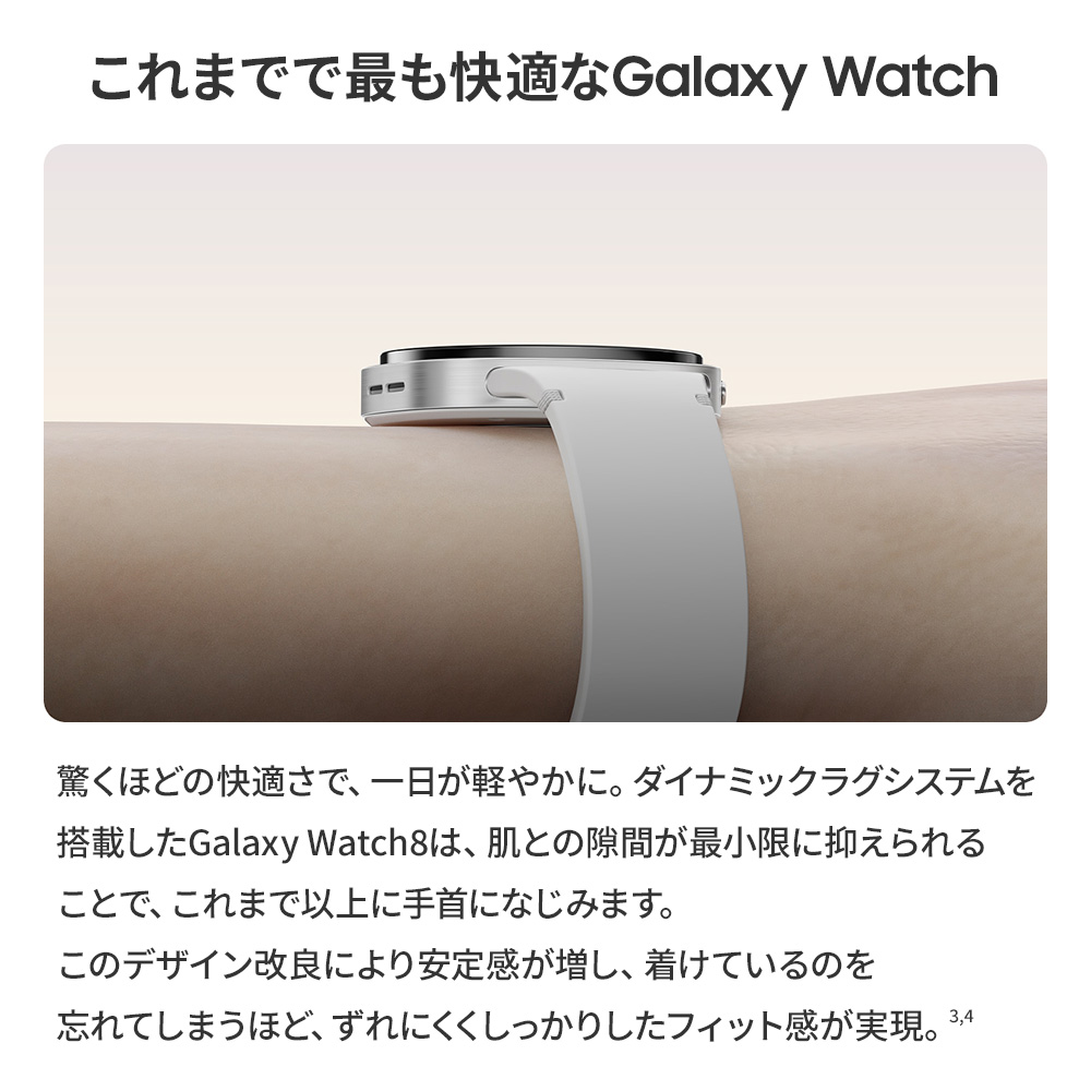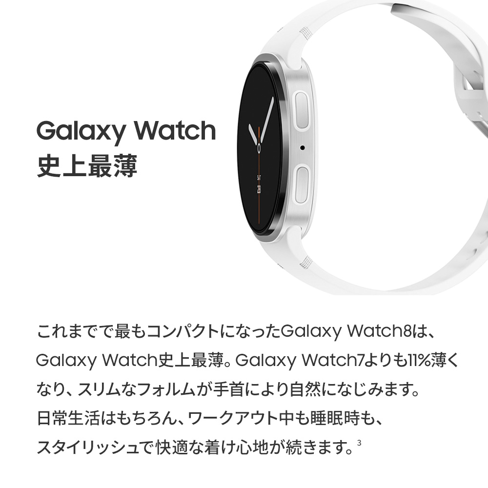 - Samsung Galaxy Watch8従来の形状から大きく変貌を遂げ、レガシーなクッションデザインにアップデート。ミニマルかつシックな装いはどんなスタイルにもフィットします。更なるレベルアップを果たしたヘルス機能やワークアウト機能に加えて、話題のAI"Gemini"との連携が、より便利で快適な体験をもたらします。もちろんFeliCaにも対応。耐水レベル防水コネクティビティ技術BluetoothGPSスマートフォン経由のGPS商品形態クッションFelica対応付属品本体/ワイヤレス充電ドック/バンド/クイックスタートガイド電池容量■40mm325mAh(ミリアンペア時間)■44mm435mAh(ミリアンペア時間)製品サイズ(高さ×幅×奥行)■40mm42.7 x 40.4 x 8.6mm■44mm46.0 x 43.7 x 8.6mm重量■40mm30g■44mm34gGalaxy Care(有償保証)について本ストアで購入された製品はGalaxy Care(有償保証)の対象となります。Galaxy Careについて詳しくは製品箱に同梱されているクイックスタートガイドをご確認ください。備考*画像はイメージです。実際のUX/UIとは異なる場合があります。 *一部のGalaxy AIの機能の使用には、Samsungアカウントへのログインが必要な場合があります。1.モデルやカラー、サイズ、ウォッチバンドの取り扱い有無は、国や地域、キャリアによって異なる場合があります。2.シーケンスは短縮し、シミュレーションしたものです。結果はイメージです。3.Galaxy Watchの従来のシリーズと比較した場合。4.Samsung社内試験条件に基づいています。合計100名の手首を対象に7種の姿勢で試験を行っています。試験には、Galaxy Watch7(44mm)、Galaxy Watch8(44mm)、Galaxy Watch6 Classic(46mm)、Galaxy Watch8 Classicを使用しました。5.就寝時刻のガイダンスはAndroidのスマートフォン(Android 11以降)でご利用いただけます。「Samsung Health」アプリ(v6.30.2以降)が必要です。就寝時刻ガイダンスは、ユーザーの概日リズムと睡眠圧の3日分の分析結果に基づいています。心身の健康維持・増進のみを目的としています。測定値は、個人的な参考情報としてご使用ください。睡眠障害や疾患の検出、診断、治療での使用を目的としたものではありません。医療的なアドバイスは、医療専門家にご相談ください。18.血管負荷測定機能にアクセスするには、Androidのスマートフォン(Android 10以降)と、「Samsung Health」アプリ(v6.30.2以降)が必要です。Samsungアカウントへのログインが必要です。血管負荷を測定するには、まず直近14日間のうち3日間以上、Galaxy Watch(Galaxy Watch Ultra、Watch8以降に発売されたGalaxy Watchシリーズ)を睡眠時に装着する必要があります。19.血管負荷のモニタリング機能は、心身の健康維持・増進のみを目的としています。心血管疾患と診断された方や、手術後の回復期にある方は、必ず医師の治療計画に従ってください。本機能は、公式発表前にプレビュー可能なLabs機能です。この実験機能の利用を希望されない場合は、Samsung Healthの設定からオフにすることができます。20.抗酸化指数はAndroidのスマートフォン(Android 10以降)でご利用いただけます。「Samsung Health」アプリ(v6.30.2以降)が必要です。Samsungアカウントへのログインが必要です。21.測定するには、スマートウォッチの裏面にあるセンサーに指の中心部を乗せ、5秒間そのままの状態を維持します。抗酸化指数はどの指でも測定できますが、最も正確な結果を得るには親指で測定することをおすすめします。22.肌の凹凸のために測定を繰り返すと、結果が不正確になる可能性があります。23.抗酸化指数は、心身の健康維持・増進のみを目的としています。疾患の検出、診断、治療の目的でご使用いただくことはできません。ご自身の抗酸化レベルについて懸念がある場合は、医療専門家にご相談ください。本機能は、公式発表前にプレビュー可能なLabs機能です。この実験機能の利用を希望されない場合は、Samsung Healthの設定からオフにすることができます。32.Now Bar対応アプリは、ソフトウェアのバージョン、デバイスのモデル、地域などによって異なる場合があります。