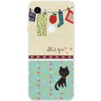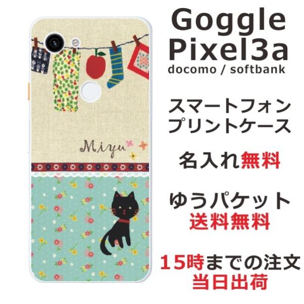 Google Pixel3a ケース グーグルピクセル3a カバー らふら 名入れ 黒猫と洗濯物ブルー花