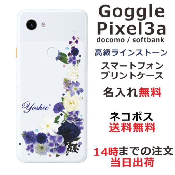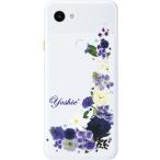 Google Pixel3a ケース グーグルピクセル3a カバー ラインストーン かわいい フラワー 花柄 らふら 名入れ 押し花風 ブルーアレンジ